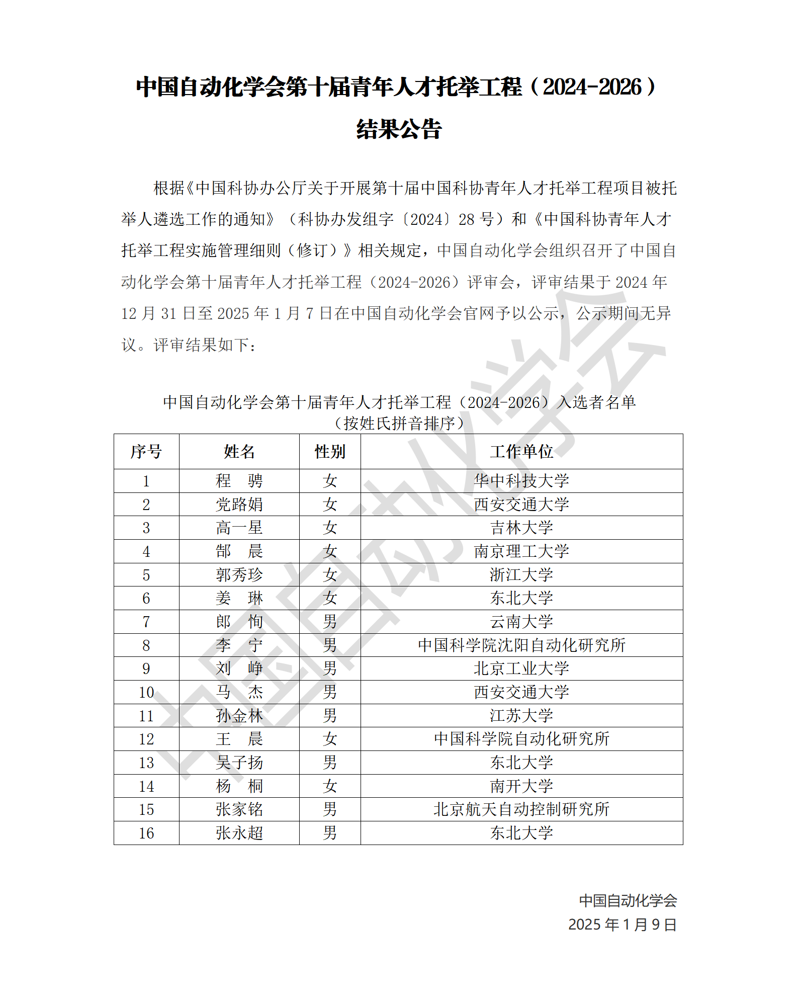 中国自动化学会第十届青年人才托举工程(2024-2026)结果公告