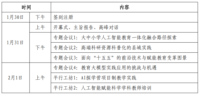 本次大会聚焦大中小学人工智能教育一体化融合、高端科研资源科普化县域实践、前沿技术赋能教育变革及教育大模型实践应用等核心方向, 通过开幕式、主旨报告、专题会议研讨、名师工作坊等多元形式,搭建传 播智能科技、弘扬科学家精神、提升科技教育品质的高端平台,推动创新 后备人才早期发现与贯通培养深度融合,为教育强国、科技强国、人才强国建设提供有力支撑。