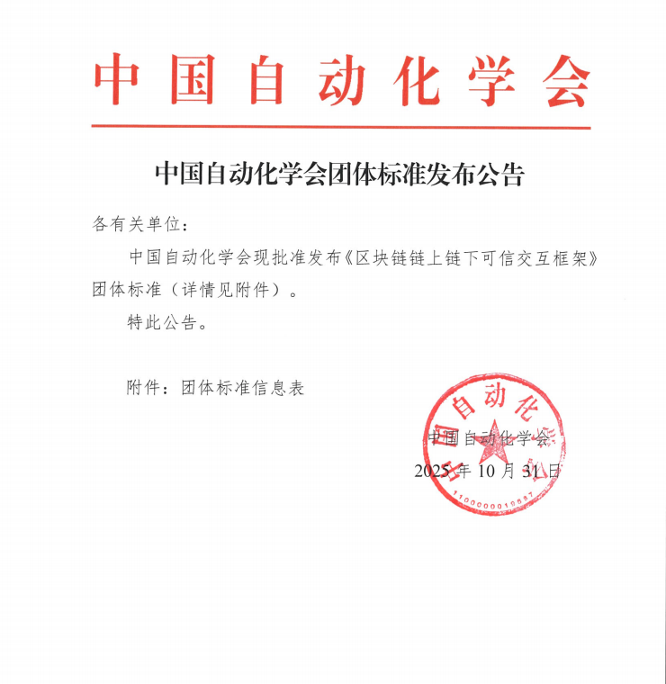 中国自动化学会现批准发布《区块链链上链下可信交互框架》团体标准(详情见附件)。