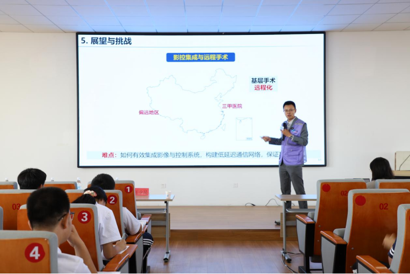 在科普报告环节,桂美将老师以医生的科技队友是谁?共探手术机器人的发展故事为题,深入浅出地介绍了手术机器人的发展历程、技术原理及应用前景,让师生们对这一前沿科技有了更直观的认识。报告围绕手术机器人提升手术精准度、降低操作难度的核心价值,按细分领域阐述腹腔镜手术机器人的技术成熟度与临床普及情况,探讨经自然腔道手术机器人在减创伤、促康复方面的探索等。报告最后对手术机器人的研究进行了展望,使同学们大开眼界,对手术机器人有了进一步的认识。