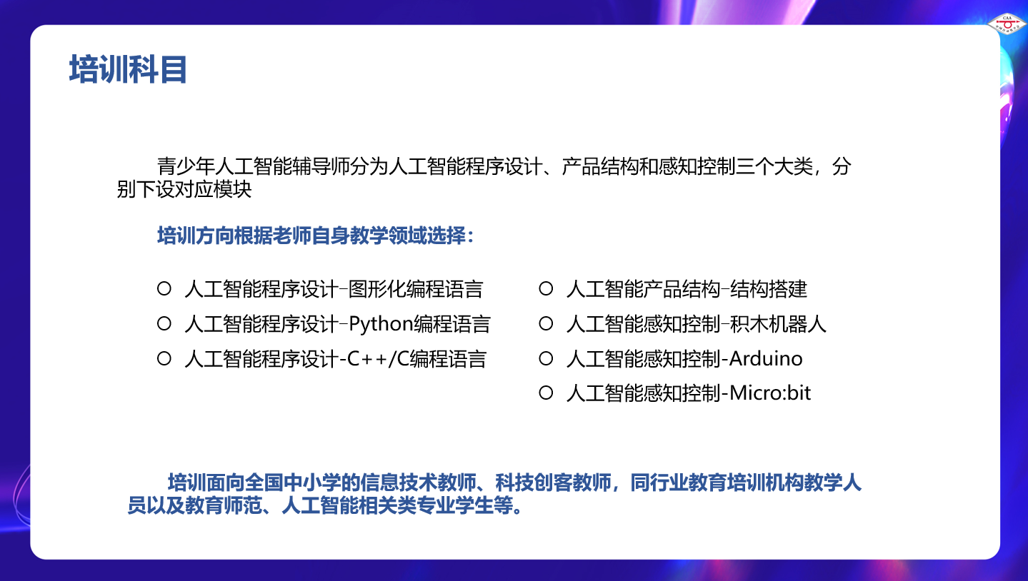 为贯彻落实国务院《新一代人工智能发展规划》和《全民科学素质行动规划纲要(2021-2035年)》中的有关要求,推进人工智能教育的普及,助力人工智能时代所需的人才培养,培养相关师资和裁判人才,中国自动化学会发起了青少年人工智能辅导师和青少年人工智能活动裁判员的培训工作。本期培训时间为2022年10月24日至11月5日,随即在11月6日进行培训后的考核,报名参加课程培训并在考核中成绩合格的学员,将获得由中国自动化学会颁发的“青少年人工智能辅导师证书”或“青少年人工智能活动裁判员证书”。
