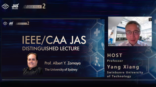 2026年1月6日14:00(北京时间),中国自动化学会(CAA)与 IEEE/CAA Journal of Automatica Sinica(JAS)联合主办的2026年第1期(总第2期) JAS 杰出讲座(IEEE/CAA JAS Distinguished Lecture)成功举办。澳大利亚悉尼大学Albert Y. Zomaya教授以“边缘原生临床人工智能的崛起:生成式模型、分布式系统与医疗未来”(The Rise of Edge-Native Clinical AI: Generative Models, Distributed Systems, and the Future of Medicine)为题进行主旨演讲。本次讲座通过学会视频号、B站、知乎、抖音以及新华社、网易科技等平台面向全球同步直播,吸引了近40万名海内外专业学者、科研人员及高校学生线上参与。