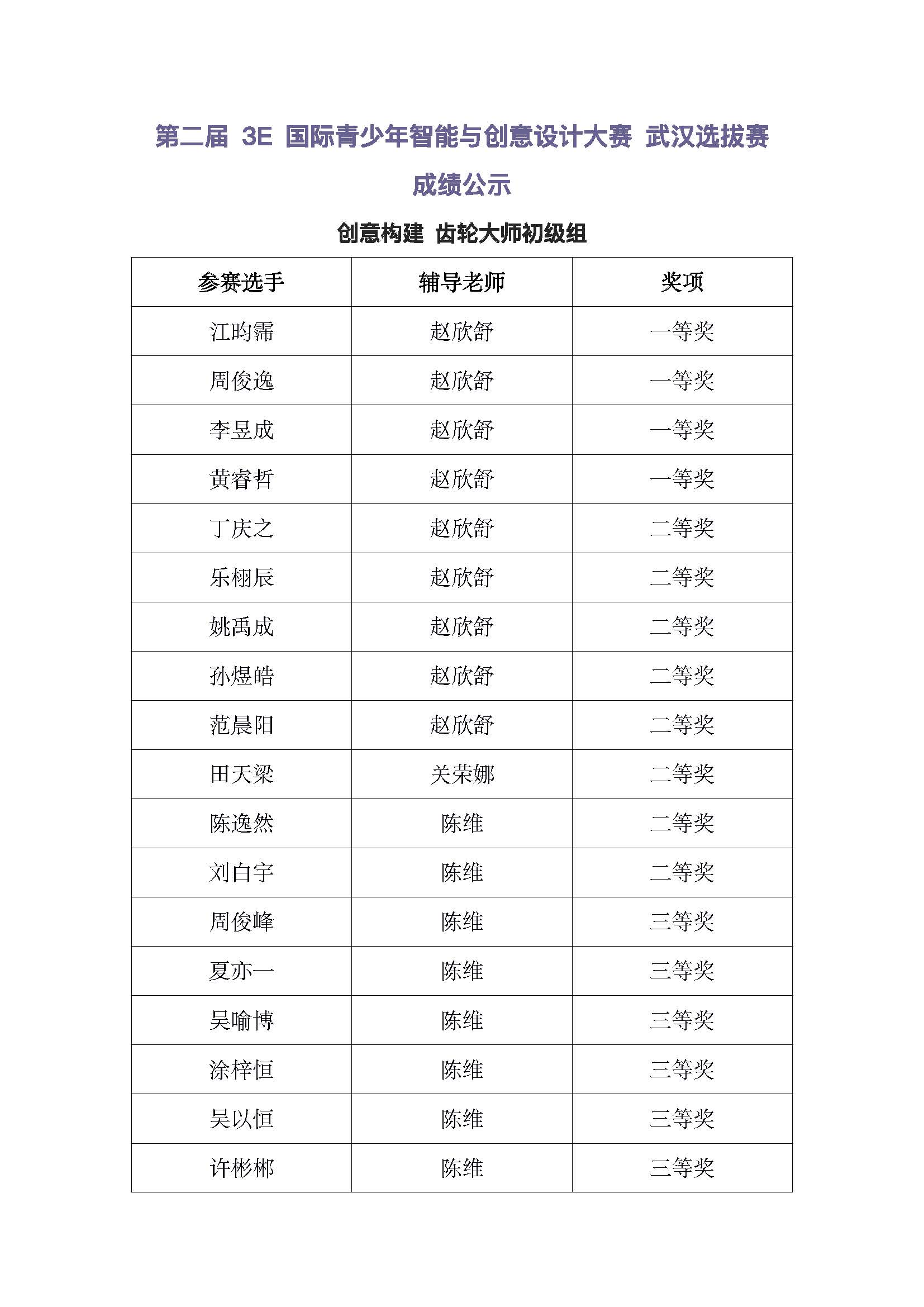 第二届3E 国际青少年智能与创意设计大赛武汉选拔赛 成绩公示