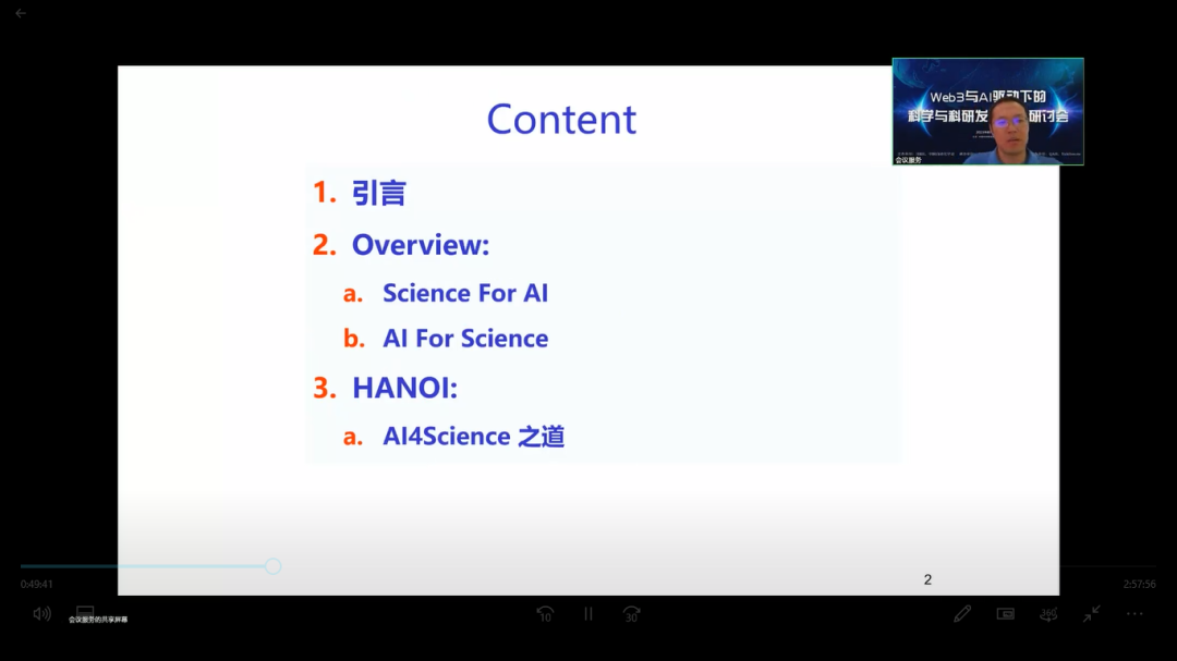 中国科学院大学人工智能学院缪青海副教授发表题为“HANOI: AI4Science之道”的主题报告,在报告中简述 Science4AI与AI4Science的研究进展,同时分析范例AlphaFold 和 ChatGPT 的基本原理和关键技术,并在以上分析的基础上,从算法、模型、数据、知识、人的因素等角度,总结大模型时代人工智能技术发展新趋势,探讨 AI4Science 研究新范式。