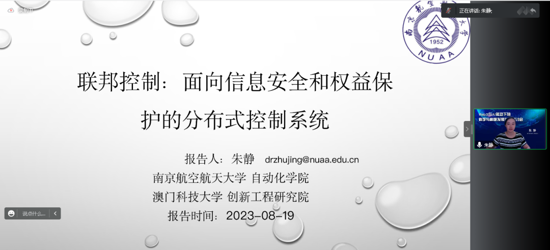 南京航空航天大学朱静副教授的报告题目“联邦控制:面向信息安全和权益保护的分布式控制系统”,提出了一种基于联邦智能的分布式控制方法——联邦控制,作为联邦生态的核心环节, 联邦控制从联邦智能的需求响应出发, 以联邦数据的信息安全和权益保护为目标, 以区块链、平行系统为技术支撑, 为大型复杂系统提供高效、安全、可靠的控制与管理。