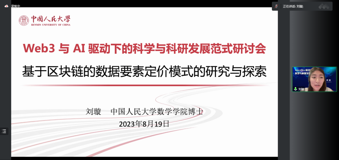 中国人民大学数学学院的刘璇博士作了题为“基于区块链的数据要素定价模式研究与探索”的主题报告,刘璇博士在报告中主要从数据要素市场发展概况、数据要素定价模式探索与基于区块链的数据要素流通交易架构三个方面进行阐述。她表示,数据要素市场的发展目前正面临着确权难、定价难、隐私保护、监管难的四大瓶颈,因此,需要探索数据要素定价机制。此外,还讨论了如何将数据要素资本化,以及如何在数据要素定价方面进行创新。未来,刘璇博士将会深入研究基于拍卖的数据要素定价方法和智能合约模型,以实现数据交易流通过程的自动化执行。