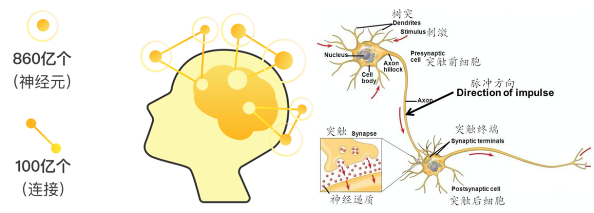 人脑是目前已知最为复杂的神经网络系统,包含约860亿个神经元(neurons),并通过约1000亿个突触连接(synapses)实现高度并行的信号传递与信息处理。神经元是神经系统的基本功能单元,其主要结构包括胞体(cell body)、树突(dendrites)、轴突(axon)及突触(synapse)。树突负责接收外部刺激与其他神经元传递的信号,轴突则将电信号传导至突触终端,并通过释放神经递质的方式与下一个神经元进行信息交互。这一过程形成了庞大而复杂的神经网络,为人类的感知、记忆、学习与决策提供了生物学基础。