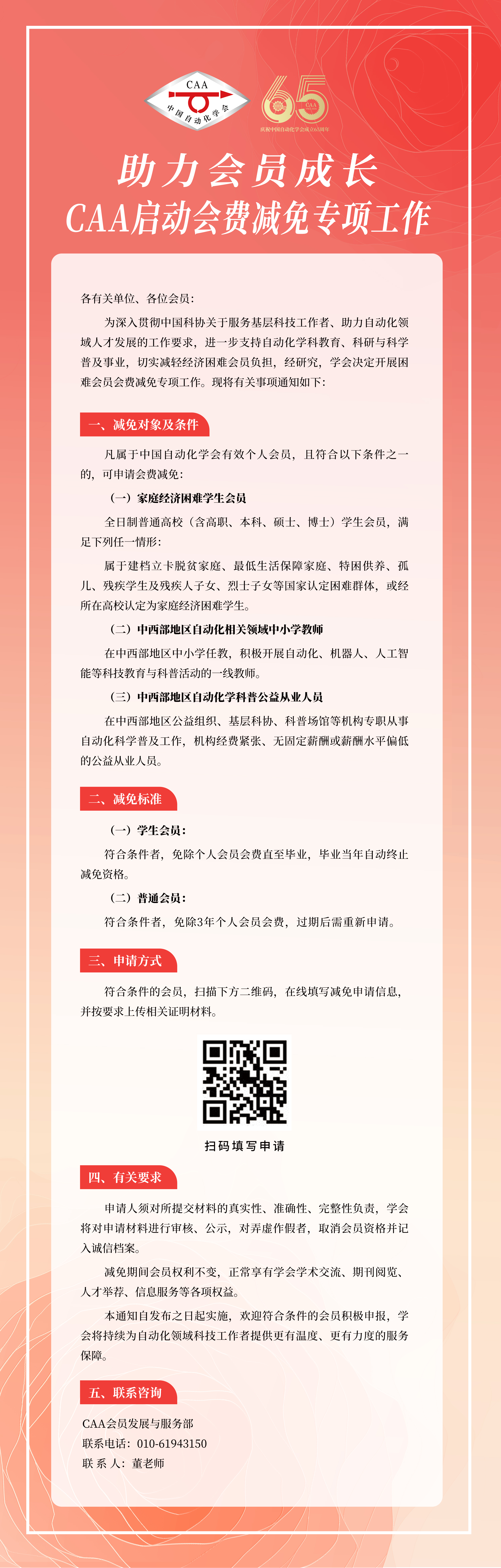 为深入贯彻中国科协关于服务基层科技工作者、助力自动化领域人才发展的工作要求,进一步支持自动化学科教育、科研与科学普及事业,切实减轻经济困难会员负担,经研究,学会决定开展困难会员会费减免专项工作。现将有关事项通知如下: