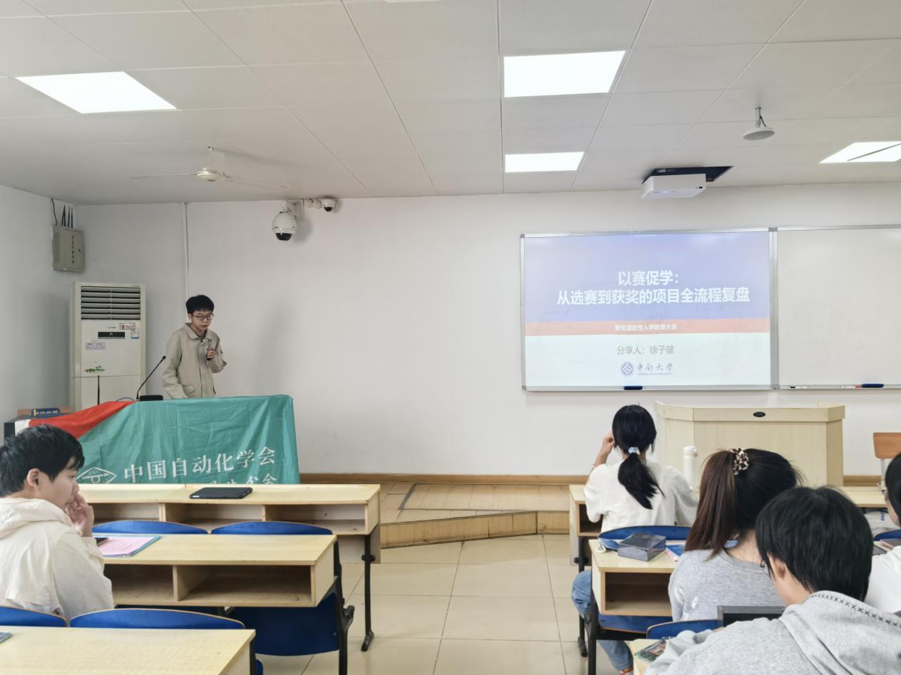 第二十届中国研究生电子设计竞赛一等奖获得者徐子健,围绕 “以赛促学:从选赛到获奖的项目全流程复盘” 为新生分享实用指引。他介绍 1996 年由中国电子学会等发起的该竞赛,设基础与商业计划书赛道,提及学院 2013 年、2025 年赛事成绩均居全国第一以凸显资源优势;结合自身作品建议方案设计聚焦行业挑战,3-4 个创新点对应解决实际问题并以科研成果支撑,确保仿真匹配应用需求;强调团队明确分工并通过代码仓库记录工作,可借助学院预答辩优化协作;说明校内资源支持,提醒关注赛事节点,线上评审通过后需备离线方案参与华中赛区答辩;建议赛后沉淀代码仓库、报告模板等经验。