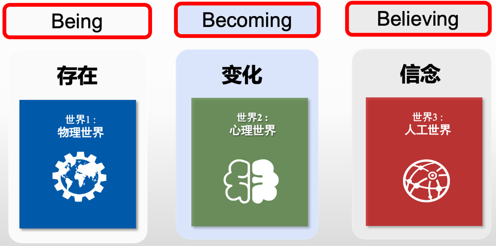 按照科学哲学的一种观点,现实由三个世界构成:物理世界、心理世界与人工世界,分别由“老IT”工业技术(Industrial Technology), “旧IT”信息技术(Information Technology )和“新IT”智能技术(Intelligent Technology )为主进行开发。当前正处于人工世界开发的关键阶段,这也是人工智能与大数据兴起的根源。大数据已成为新的资源,被视为“石油矿产”;而信息技术则经历了由一百年前的工业技术演进至今日的智能技术的转变。在这一历史脉络下,我们必须承担起新的责任与使命。